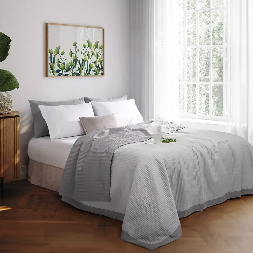 El cover quilt bicolor Jean Cartier ofrece un elegante matelaseado rayado con un delicado marco a tono, ideal para agregar un toque moderno y sofisticado a tu dormitorio.
